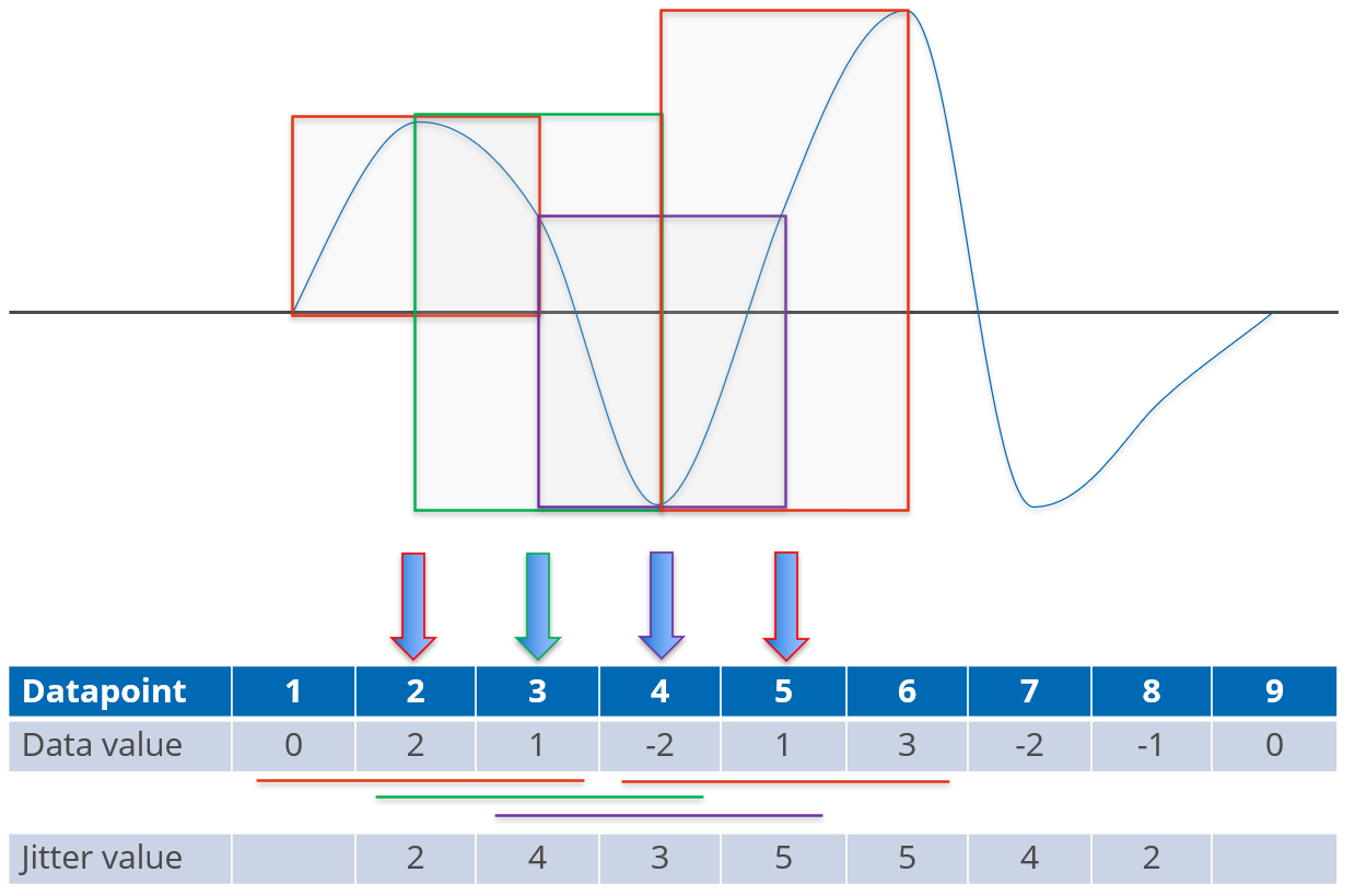 For the complete data set, we use a sliding window. In picture 3 you can see how the jitter value is defined for data points. In this example, we use a 3-data point window.